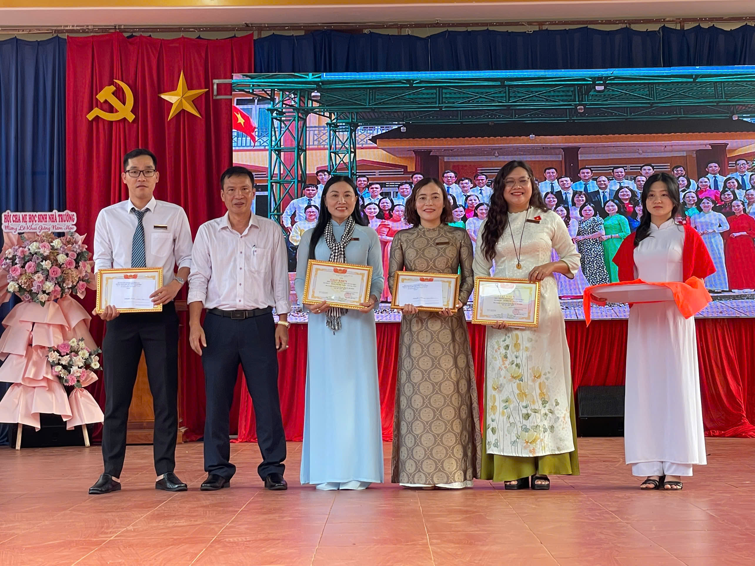 Đ/c Huỳnh Trọng Văn Phó chủ tịch UBND xã Ea Khal trao giấy khen cho các thầy cô đạt thành tích GVCN xuất sắc năm học 2024-2025