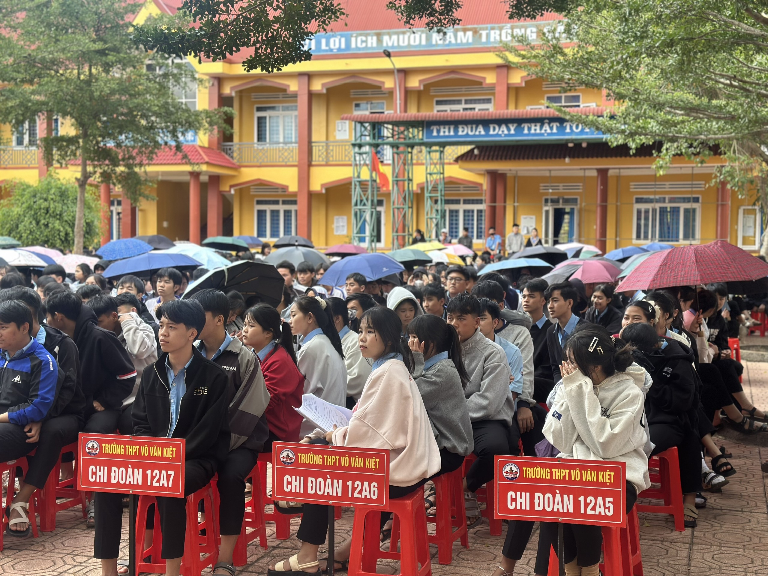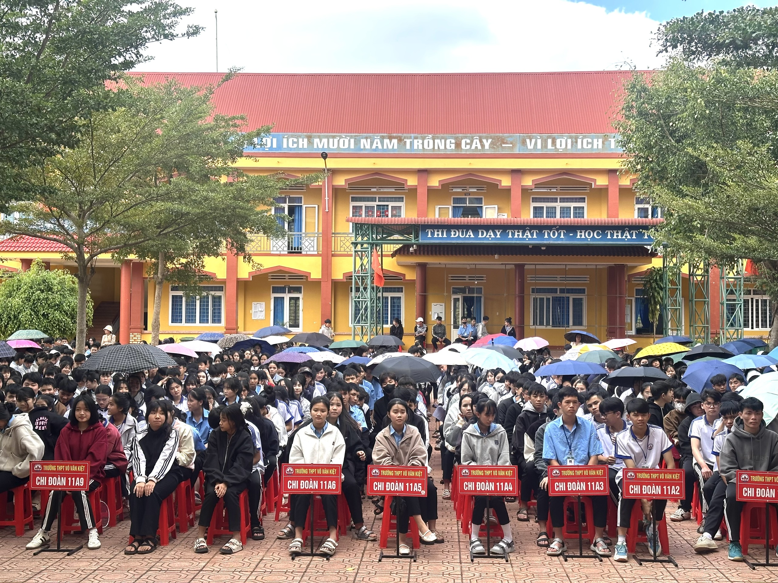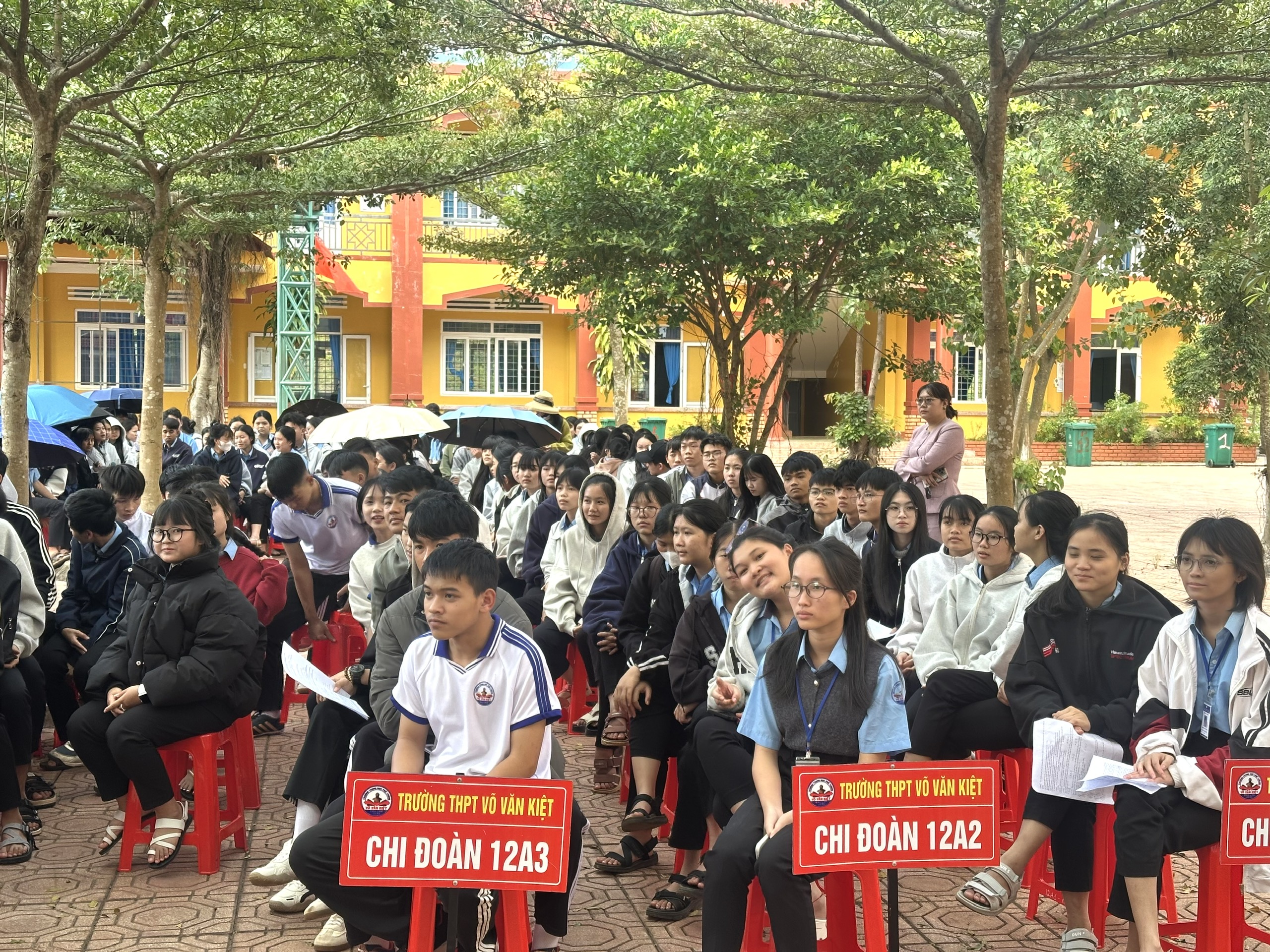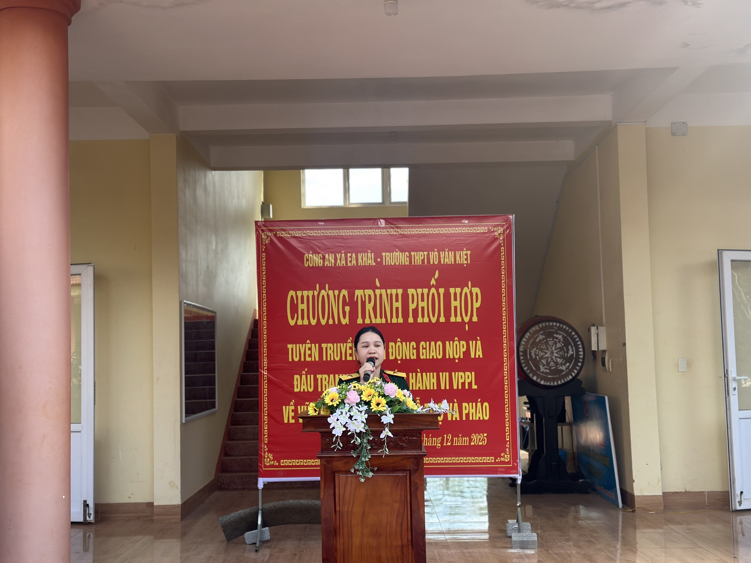 Thực hiện kế hoạch số 49/KH-UBND ngày 13/10/2025 của UBND xã Ea Khăl về mở đợt cao điểm tuyên truyền, vận động nhân dân giao nộp và đấu tranh với tội phạm, vi phạm pháp luật về vũ khí, vật liệu nổ, công cụ hỗ trợ và pháo trên địa bàn xã. Chiều ngày 30 tháng 12 năm 2025 Trường THPT Võ Văn Kiệt đã tổ chức buổi tuyên truyền về xử lí vi phạm pháp luật về vũ khí, vật liệu nổ, công cụ hỗ trợ và pháo cho cán bộ giáo viên và học sinh. Gần 1100 học sinh và 67 cán bộ giáo viên nhân viên tham gia buổi tuyên truyền. Tại buổi tuyên truyền thầy Trần Đình Thao Hiệu trưởng nhà trường đã phát biểu khai mạc và quản triệt nội dung buổi tuyên truyền. Tiếp theo chương trình cô Phan Thị Thùy Vân giáo viên môn GD Quốc phòng – An ninh đã tuyên truyền về nội dung cơ bản về những vi phạm pháp luật về vũ khí, vật liệu nổ, công cụ hỗ trợ và pháo. trong đó nhắc nhớ học sinh không được vi phạm về việc sản xuất, chế tạo, buôn bán và đốt pháo nổ. Cuối buổi tuyên truyên đại diện các lớp nhận giấy cam kết để kí cam kết không vi phạm pháp luật về vũ khí, vật liệu nổ, công cụ hỗ trợ và pháo. 100% cán bộ giáo viên nhân viên đã kí bản cam kết.